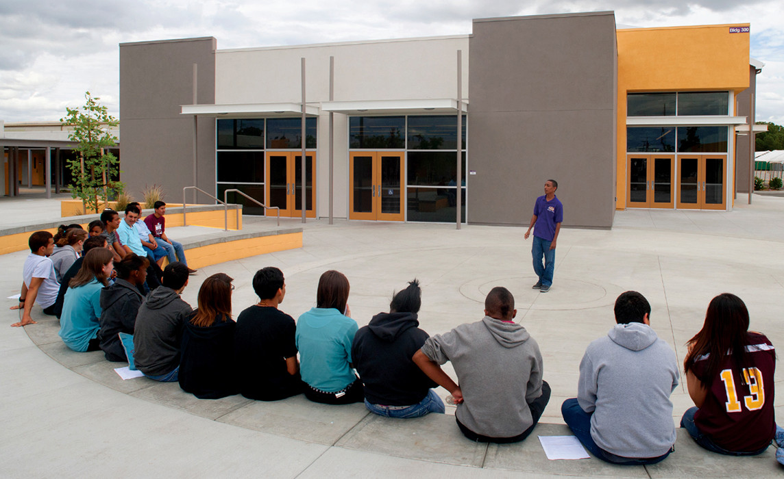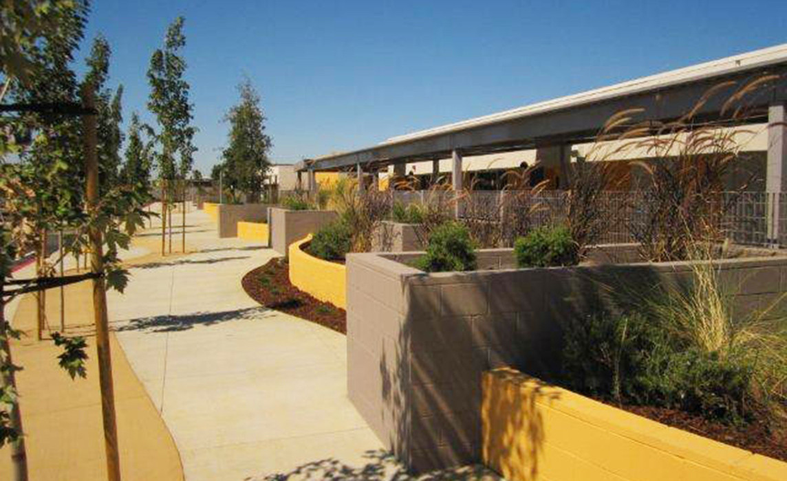 The new campus includes both the K-5 Aspire Port City Academy and the 6-12 Aspire Langston Hughes Academy and consists of five new buildings surrounding a central quad. At the heart of the campus, the quad is strategically located to separate upper and lower grade levels. This campus gathering hub operates both as a recreational area and an outdoor classroom; featuring an amphitheater that supports performances, creative interaction, and teambuilding skills. Combining colored pavement, limited useable lawn areas and drought tolerant plantings creates sustainable and distinctive outdoor spaces throughout the campus.