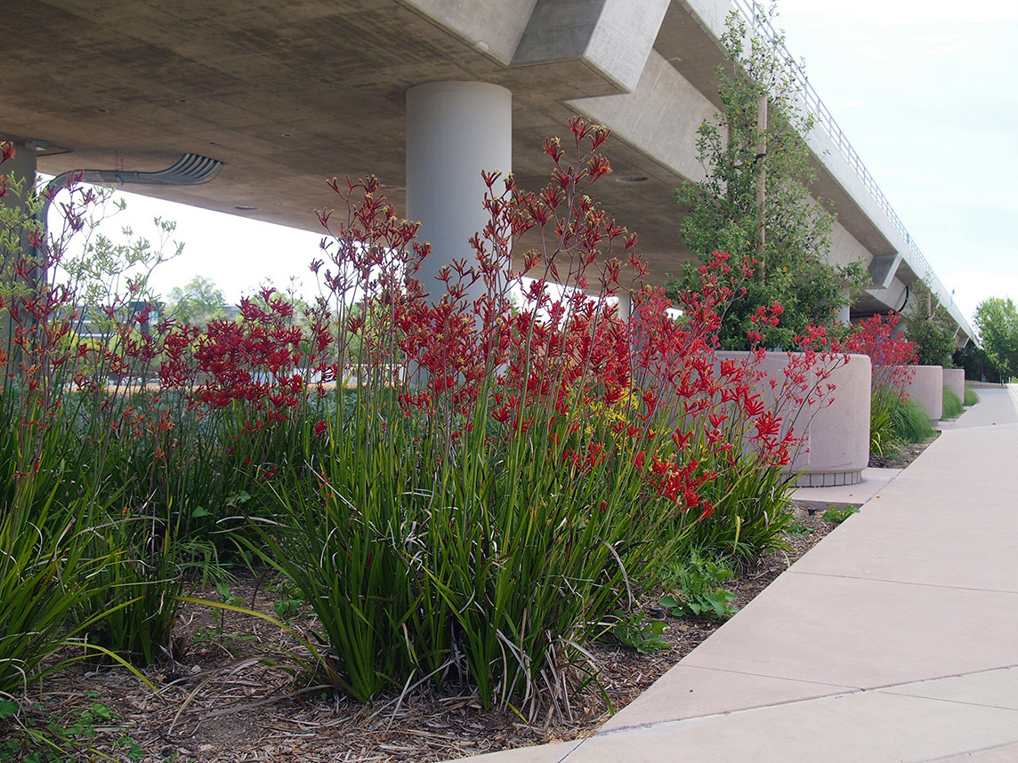 Berryessa Station Way, the curvilinear entry road, is flanked with informally arranged larger trees building on the area’s creekside character. The plantings are a mix of broadleaf evergreen and deciduous trees as well as several varieties of conifers. This scheme is carried through the parking lots and into the riparian setback zones. A significant quantity of large trees is used to balance the scale of the station and adjacent seven-story parking structure with the rest of the campus. From the station platform, the resulting green canopy screens the access road and parking lot from view.