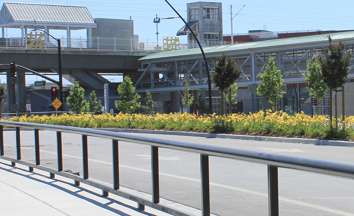 Our design team worked with city staff through conceptual and schematic design to achieve the desired interface with existing land uses and future transit oriented mixed-use development. MMP’s scope encompassed the station site and campus urban design. Decorative concrete paving, colored concrete, seat walls, and pedestrian lighting were incorporated into MMP’s design for the parking structure, drop off zones, and transit center areas. Our street improvements included stormwater management strategies, stormwater detention area planting, and street trees for campus streets and parking areas. Pedestrian crosswalks were designed with enhanced paving techniques for visibility and aesthetic interest.