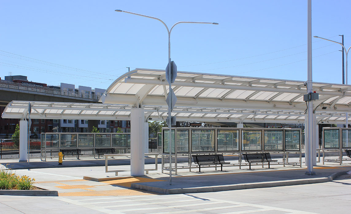 Opened in 2020, Milpitas Station is the first stop on the BART extension into Santa Clara County. This transit facility is an elegant urban campus enriched by passenger shelters, site furnishings, lighting, trees, and ground plane planting. Circulation is skillfully organized to promote intermodal connectivity in a “grand station” style between BART, VTA trains and bus transit, bike trails, pedestrian ways, and on-grade and structured parking facilities. MMP’s landscape design utilizes dramatic contrasting bands of paving and continues the station floor’s column grid pattern through the vehicular paving area, guiding the user, intermodal or transfer passenger safely through the site. A plaza area for the parking structure is designed to create space for food trucks and small retail vendors.