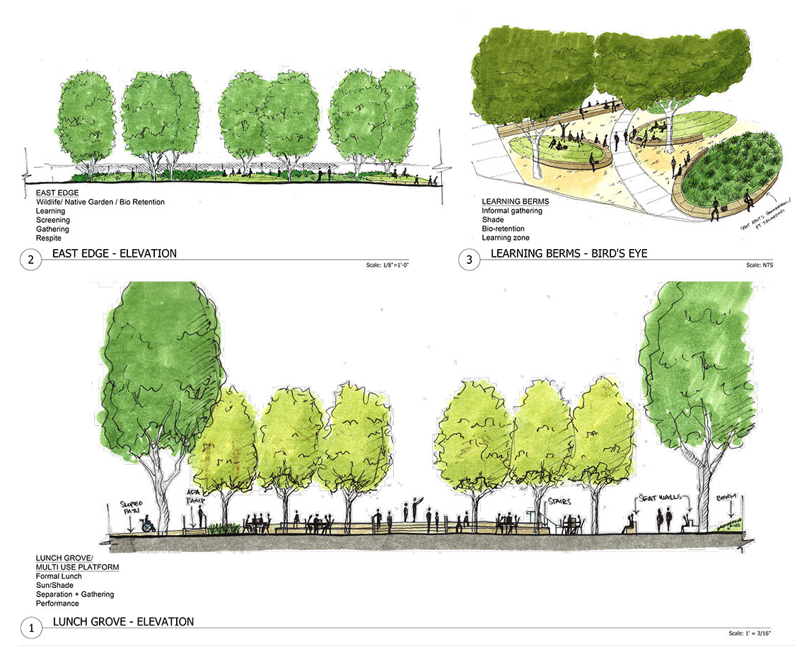 - A shaded “Lunch Grove” with formal seating and gathering platforms.