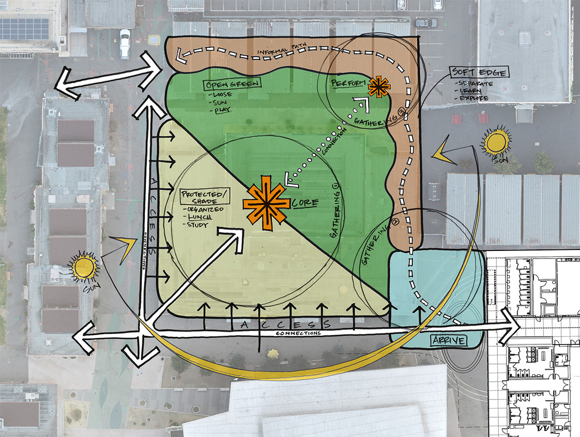 The courtyard design responds to ambitious goals for inclusivity, durability, and programmatic flexibility. Informed by community workshops and the School District’s priorities, the courtyard integrates a full-size basketball court, shaded outdoor lunch areas, informal gathering zones, and a vibrant pedestrian network connecting key campus facilities. Designed for resilience and student well-being, the plan incorporates a variety of landscape features to mitigate the urban heat island effect, manage stormwater, and encourage safe, social, and educational uses throughout the school day and beyond.