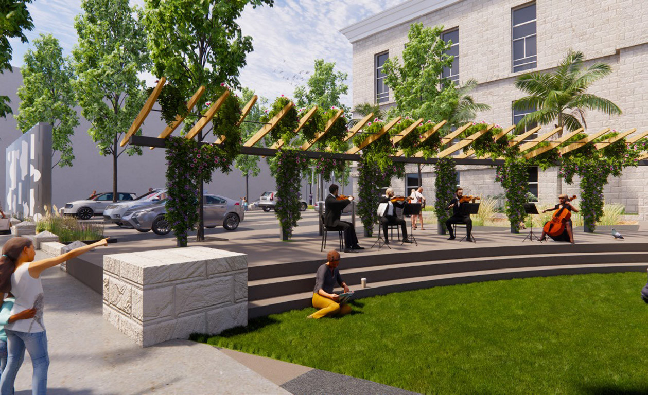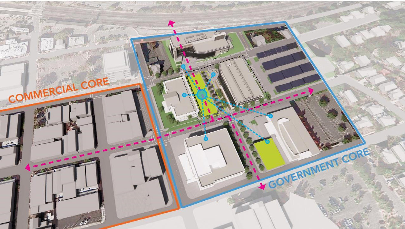 This plaza with aggregated uses provides the synergistic opportunity to achieve an activated campus hub for the Government District and to contribute a plaza that comfortably provides a flexible community amenity for smaller group activities and grand events alike.