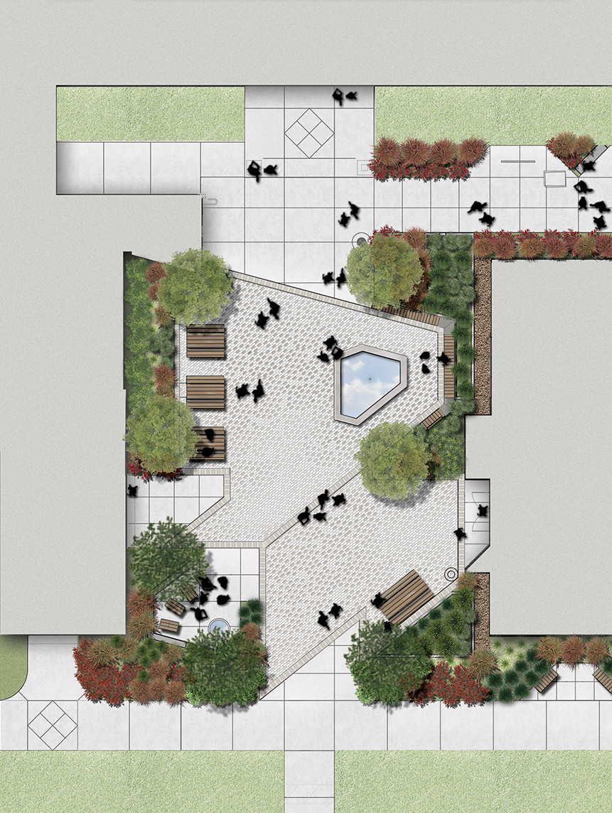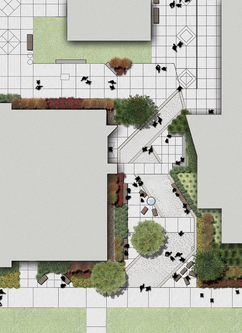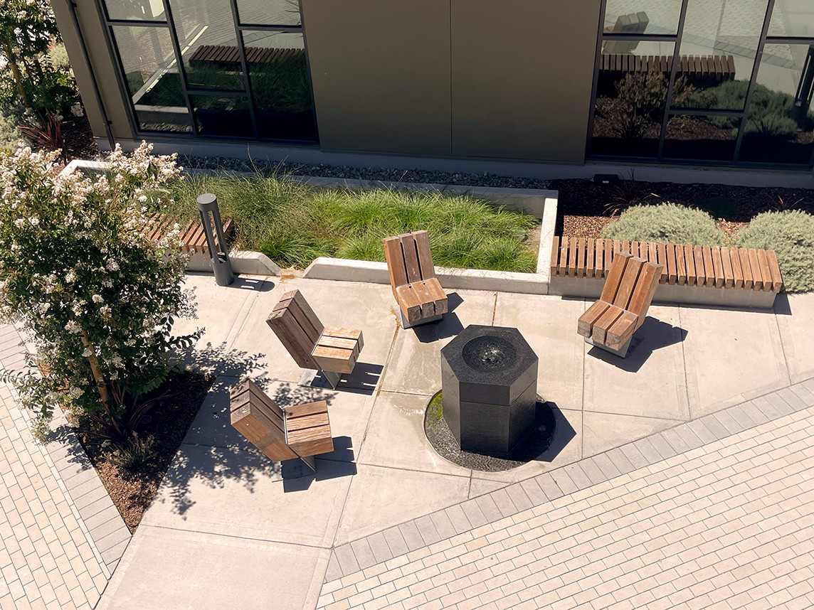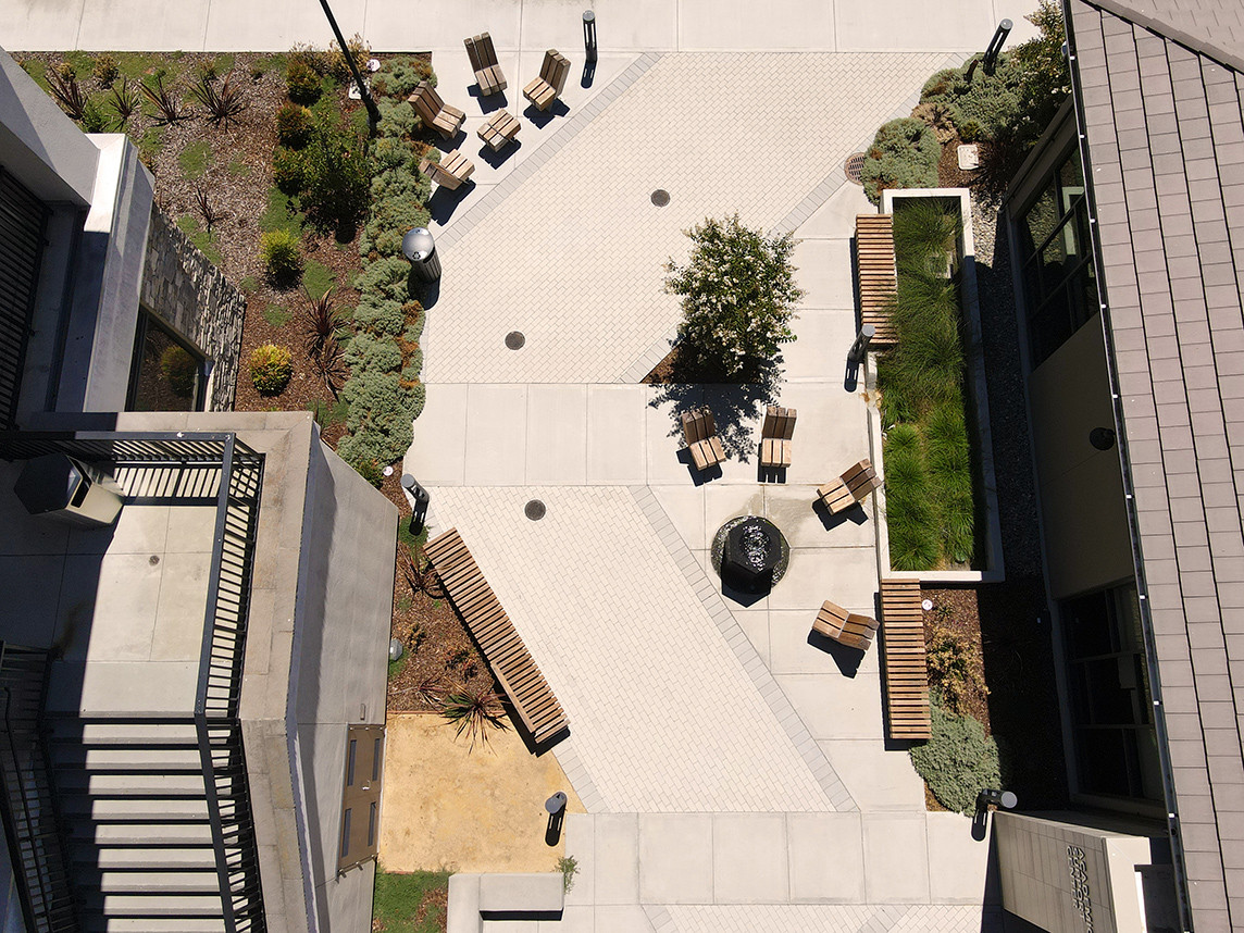 MMP designed a unique sculptural fountain made of multiple vertical stones spilling water into a subsurface recirculating system to replace an outdated fountain on the quad. This reinvented plaza is a special and intimate place with seating clusters grouped around the featured fountain. The landscape design utilizes climate appropriate, low water use plant material. Large expanses of lawn have been converted to drought tolerant planting. A state-of-the-art water efficient irrigation system is centrally controlled by facilities/maintenance staff. On-site stormwater management with bioretention and significant areas of permeable pavers were incorporated.