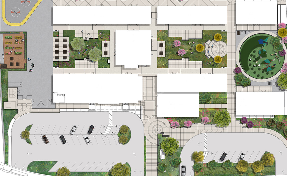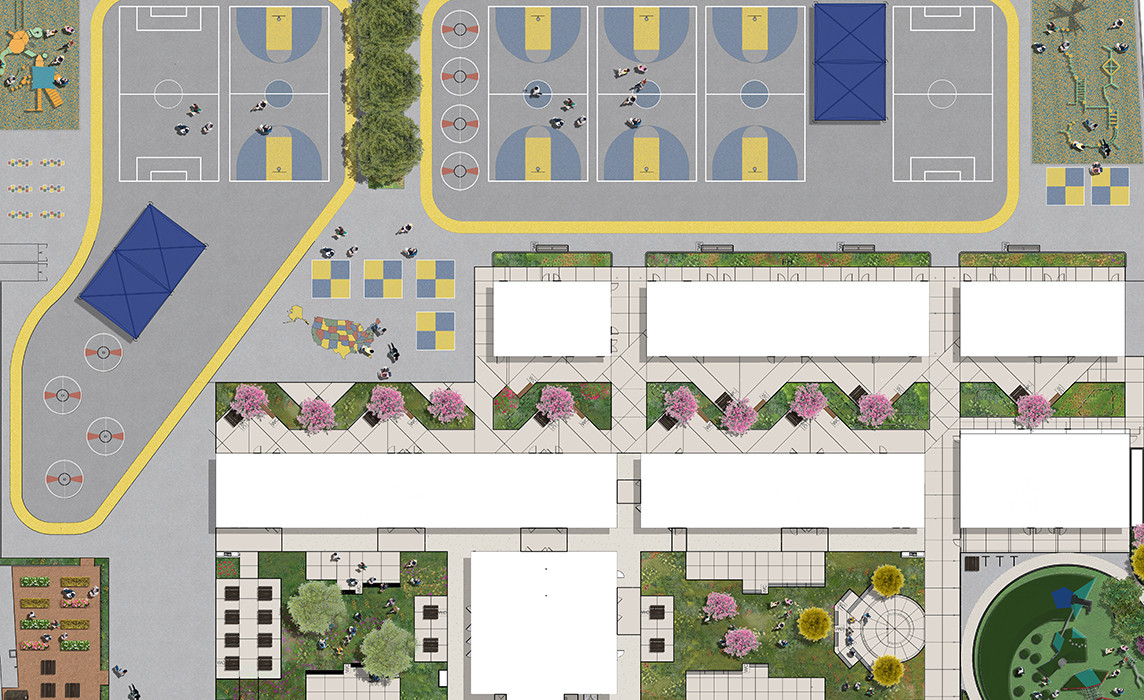 The first phase consisted of site parking improvements, new school buildings, unique berms in the Kindergarten play area, and new quad space featuring an outdoor classroom. The second phase upgraded existing buildings and quad spaces, created a new playground shelter, and expanded the play yard. The final phase will reconfigure an existing parking lot and develop public access to the existing playfields on campus.