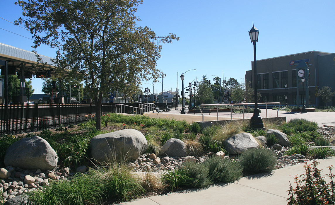 The Arcadia Civic & Transit Plaza provides a welcoming and attractive space for transit riders and a civic community gathering space for the city. It provides an outdoor stage for entertainment opportunities, seating, unique clock tower, information kiosk, decorative hardscape, landscaped planting areas, and special lighting. The stormwater planting areas feature boulders, rock, and planting in naturalistic compositions throughout the plaza. This Design-Build project for the City of Arcadia and the Metro Gold Line is part of a 6-station light rail extension intermodal parking facilities and enhancements for the cities of Arcadia, Monrovia, Duarte, Irwindale, and Azusa (Azuza-Alameda and Azuza-Citrus stations).