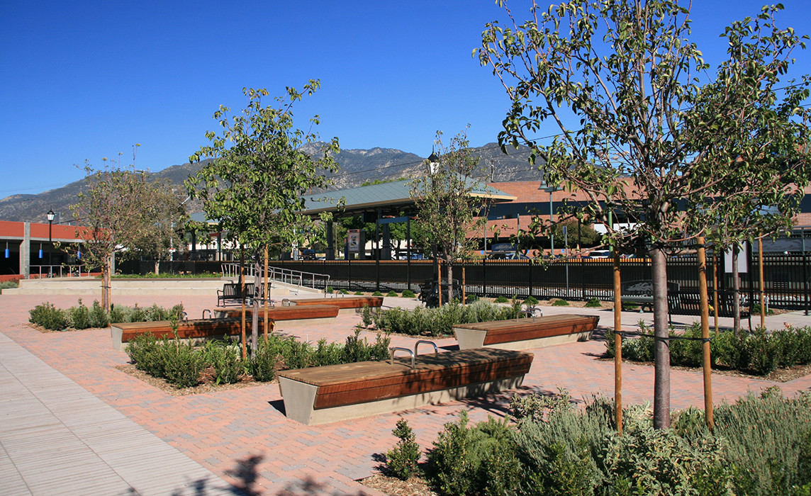 MMP provided full landscape architectural services, including design, irrigation, and planting for the surface parking area. The Arcadia Transit Plaza included a design development process and presentation of design alternatives, team concept design workshops with the city, and city approvals process. MMP provided design for amenities including bike lockers and bike racks, benches, sidewalks, enhanced crosswalks, planting, hardscape, trees and tree wells, pedestrian streetlights, bus pads, irrigation, and stormwater bioswale facility for parking structure runoff.