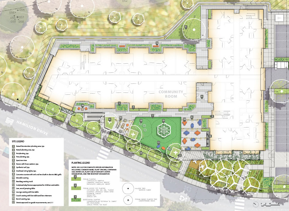 The project features a community room and exterior amenity deck complete with a soft surface with sculptural net-play element for kids and hard surface with a colorful selection of tables and chairs adjacent to an outdoor kitchen, set atop a podium which includes parking, building entry lobby, bike room and building services.