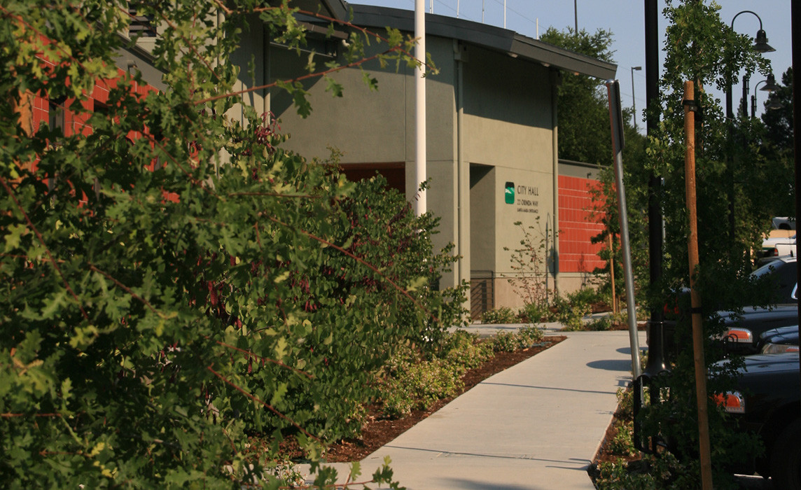 A highly collaborative design process led to a climate-responsive design and LEED Gold certified City Hall. The site is a steep hillside above the main downtown and civic area, with a small creek along the northern edge. The main building lobby is an open breezeway, forming a crossroads where city government intersects a public pathway, providing significant community gathering space. A stairway cascades through the breezeway and into the landscape, creating a strong connection to the village below and other civic uses.