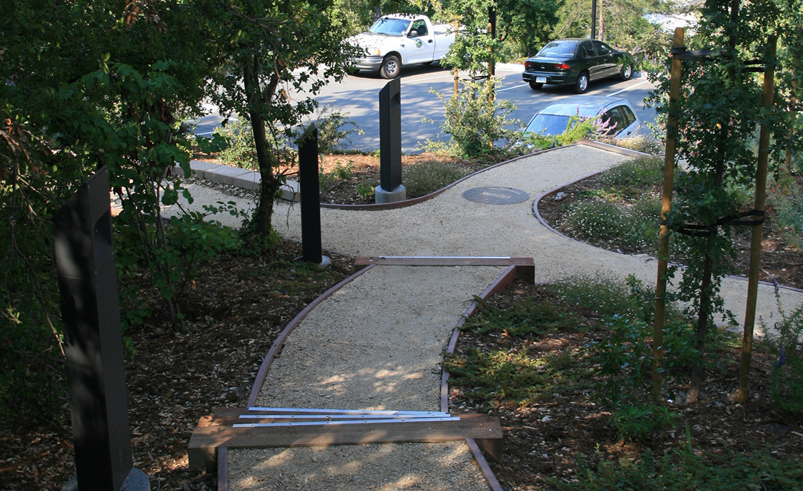 The sloped site and desire for a high LEED rating, created the opportunity for the landscape to contribute significantly to the overall planning of this successful project. The outdoor spaces utilize stormwater treatment, deciduous planting for climate control, recycled materials, chips from on-site demolition, as well as reestablishing a sustainable native Oak woodland into which the building nestles.