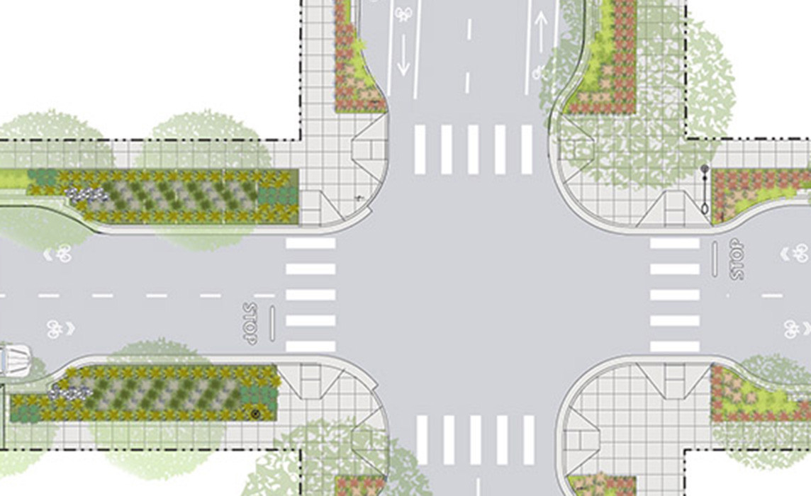 The Master Streetscape Plan (MSP) defines specific design & material standards for furnishings, planting and streetlighting. The MSP develops a vibrant, pedestrian-oriented streetscape providing improved connections to neighborhood facilities, that will support a safe and comfortable community. New drought tolerant landscaping integrates with green stormwater infiltration solutions in the right of way.