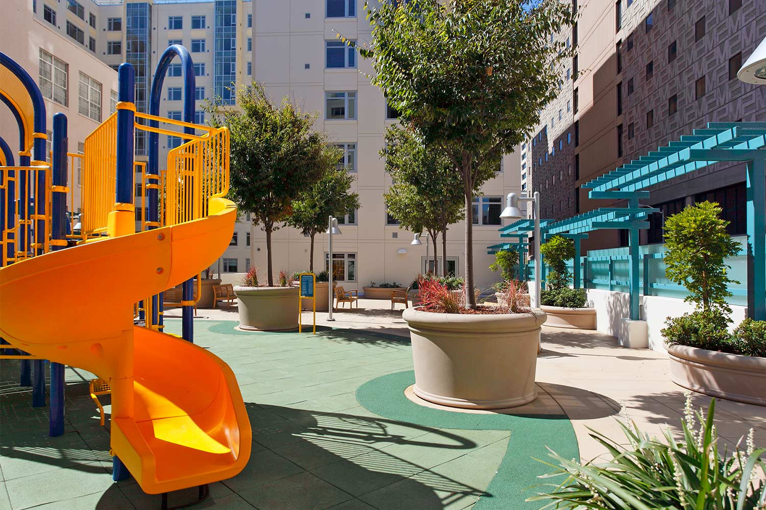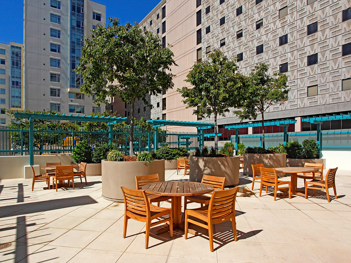 A bosque of trees in large, raised planters combine with vine arbors on the terrace to create intimate gathering spaces over the parking garage. The planters help screen these spaces and the senior’s terrace from the children’s play area. At grade, there is 6,000 square feet of open space providing a recreation area for the Youth Center, and a separate fountain courtyard with planters filled with lush bamboo, for quiet reading and enjoyment of the garden. The ground floor along Mission and 10th Street offers commercial space activating the street with retail, a diner, Youth Center and space for cultural activities and services.