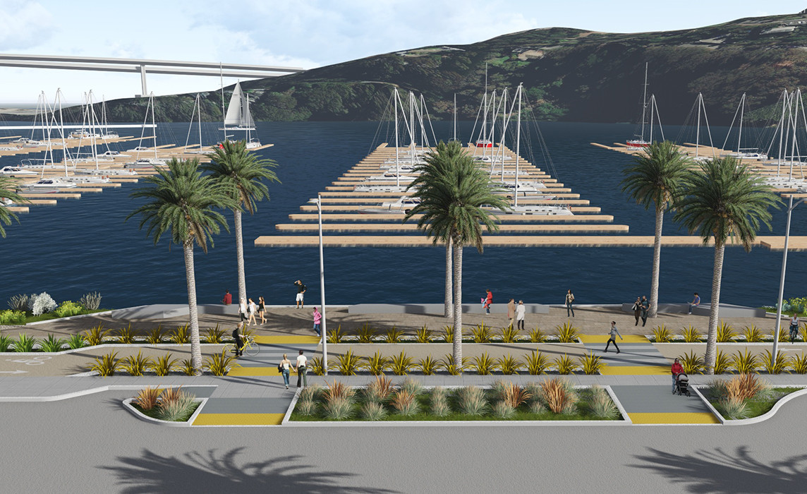 Merrill Morris Partners was invited to provide landscape architectural support for the planting design along the waterfront and streetscape system of the island, through Clipper Cove Promenade, the Causeway, and the Waterfront Plaza. The landscaping provides a connection to the plazas, nodes, and open spaces on the island. MMP has developed planting typologies for the streetscape, biofiltration areas, and pedestrian pathways. Special emphasis was paid to selecting plant material, which was drought tolerant, salt tolerant, native, and could perform biofiltration engineering requirements. Biofiltration swales lead to wetlands, filtering stormwater while providing settings for recreation and education while achieving a cohesive sense of hierarchy with the project amenities. MMP adroitly created view corridors by locating plant material to focus and enhance the natural views of the island and by creating outdoor classrooms for all to understand the innovative landscape systems.