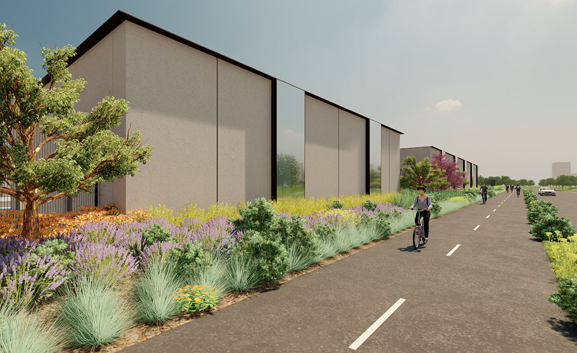 The core building concept of “a machine in the park” that guides the building massing, structural expression, and materials reflect the minimalist and industrial character of the facility and are defined as bold, simple, and beautiful. The facility will be grounded in the landscape through the use of landforms and tree groves that will provide scale and screening. Plant selection has been carefully curated to be native or adapted to the region and low water use and to thrive in shade and sun based on exposure. Custom created seed blends will be employed throughout the site via hydroseeding process with drifts of native accents establishing “the wilds” concept.