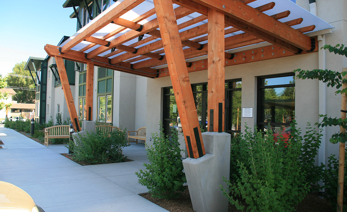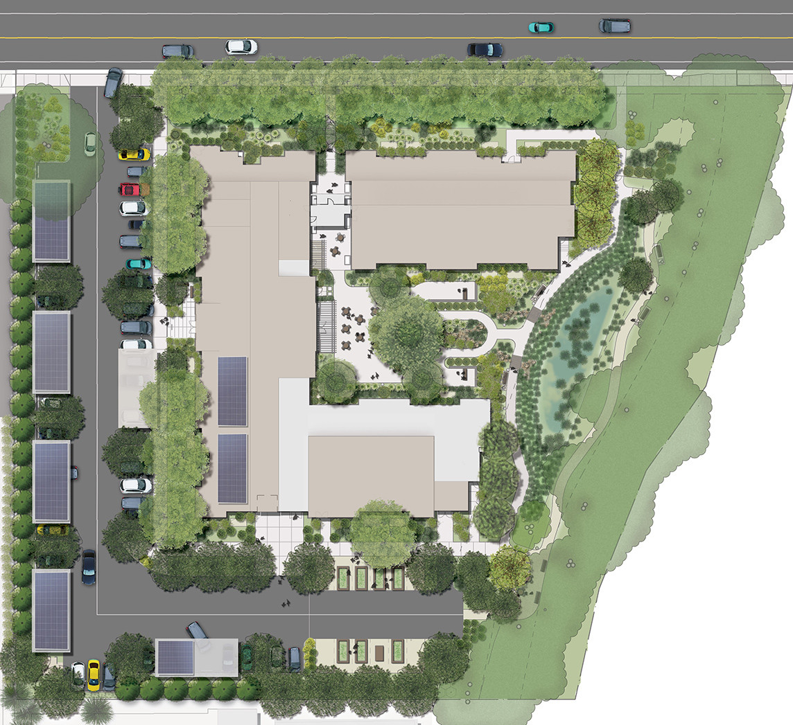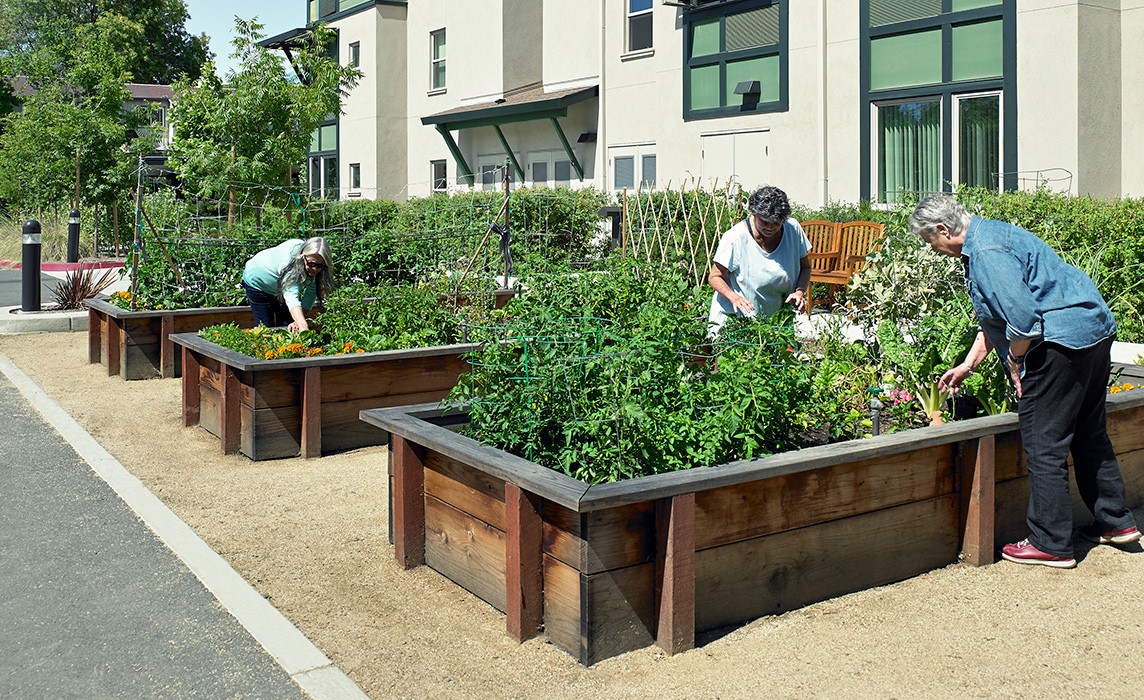 This is an affordable housing project for extremely low-income seniors, developed by the non-profit developer, Eden Housing on a 2.55-acre site. The building is a combination of two and three stories, with two story lobby and community spaces for on-site service programs for residents. The landscape development includes a community courtyard (raised outdoor patio), community garden area with raised planter beds, front and side entry planting, pathways, and parking lot planting with trees. A bridge walkway over a large, landscaped swale provides for a pleasant street-facing entry.