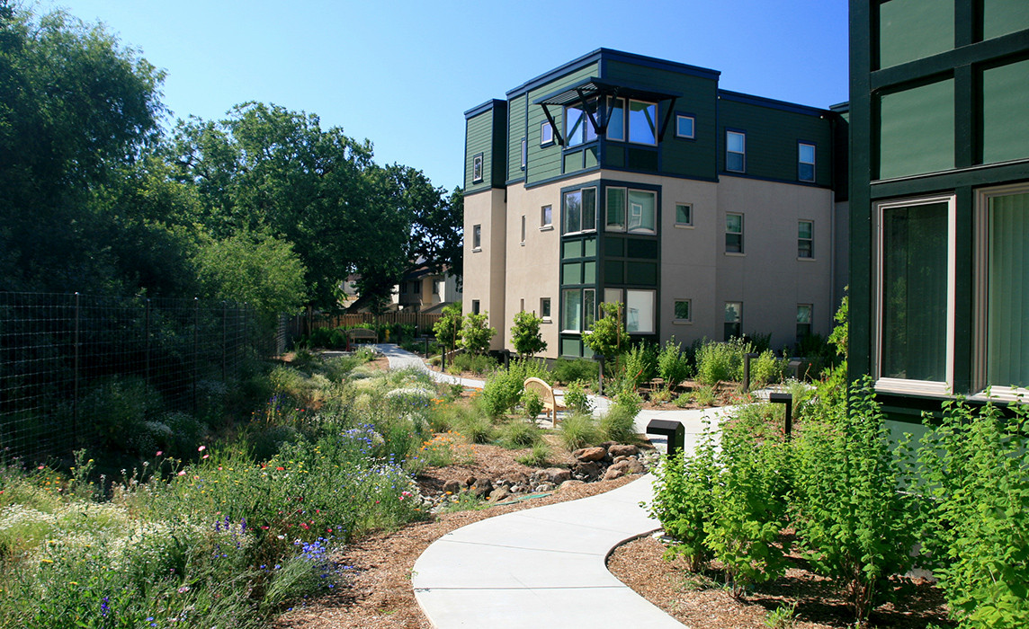 We worked closely with the architect and civil engineer to address the site challenges associated with being in a flood plain adjacent to Warner Creek. The units are constructed on a structural podium at an elevation above the flood plain. Stormwater mitigation strategies implemented to retain water on-site included constructing bioswales to receive building roof, courtyard, and pedestrian paving drainage. An existing wetland was relocated to an area immediately adjacent to Warner Creek. Permeable pavements were used extensively for the pedestrian paths that meander along the top of the creek bank. Native and low water use plant materials minimize amounts of supplemental irrigation water needed. The project is a Bay Friendly Rated Landscape.